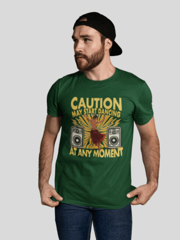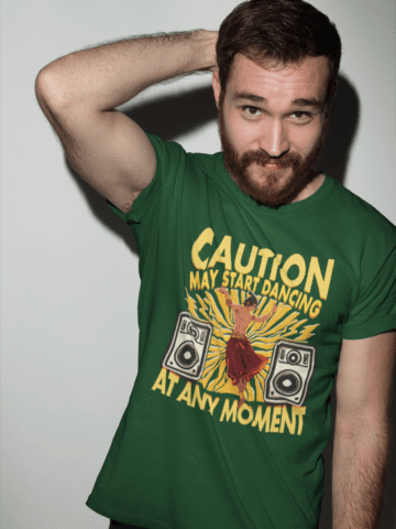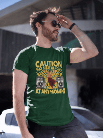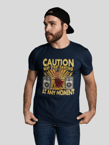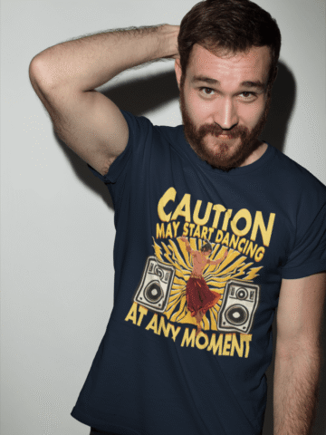 Gentlemen, unleash your inner dance machine with our “Caution: May Start Dancing at Any Moment” T-shirt.
