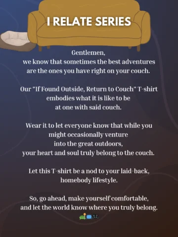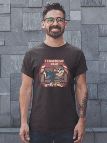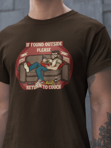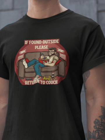 Gentlemen, we know that sometimes the best adventures are the ones you have right on your couch. Our “If Found Outside, Return to Couch” T-shirt embodies what it is like to be at one with said couch.
