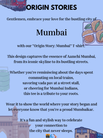 Gentlemen, embrace your love for the energetic city of Mumbai with our “Origin Story: Mumbai” T-shirt. This design captures the essence of Aamchi Mumbai, from its iconic skyline to its bustling streets.