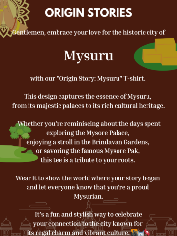 Gentlemen, embrace your love for the historic city of Mysuru with our “Origin Story: Mysuru” T-shirt. This design captures the essence of Mysuru, from its majestic palaces to its rich cultural heritage.