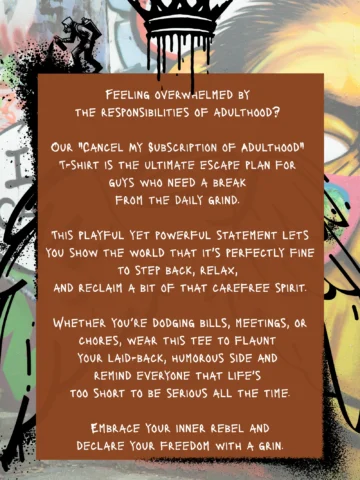 Feeling overwhelmed by the responsibilities of adulthood? Our “Cancel My Subscription of Adulthood” T-shirt is the ultimate escape plan for guys who need a break from the daily grind.