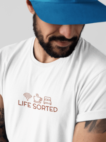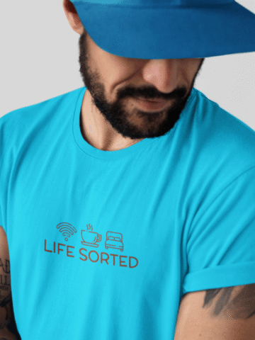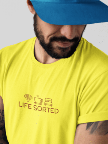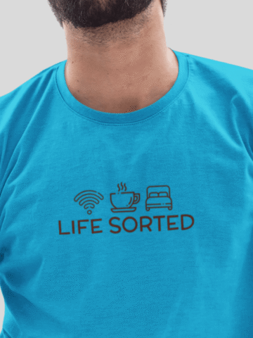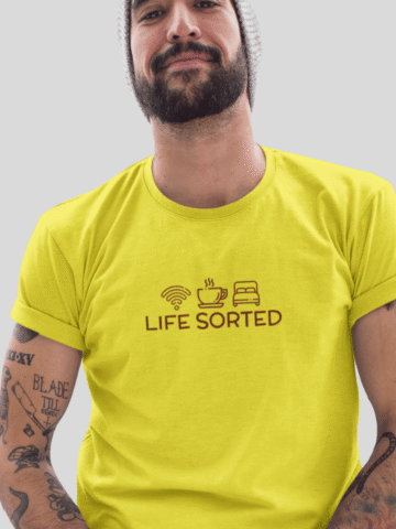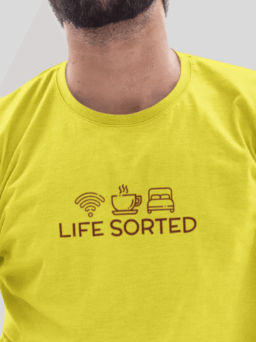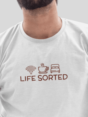 For the guys who have their priorities straight, our “Life Sorted” T-shirt is a cheeky tribute to the essentials: Wi-Fi, coffee, and sleep. âđ¤đś