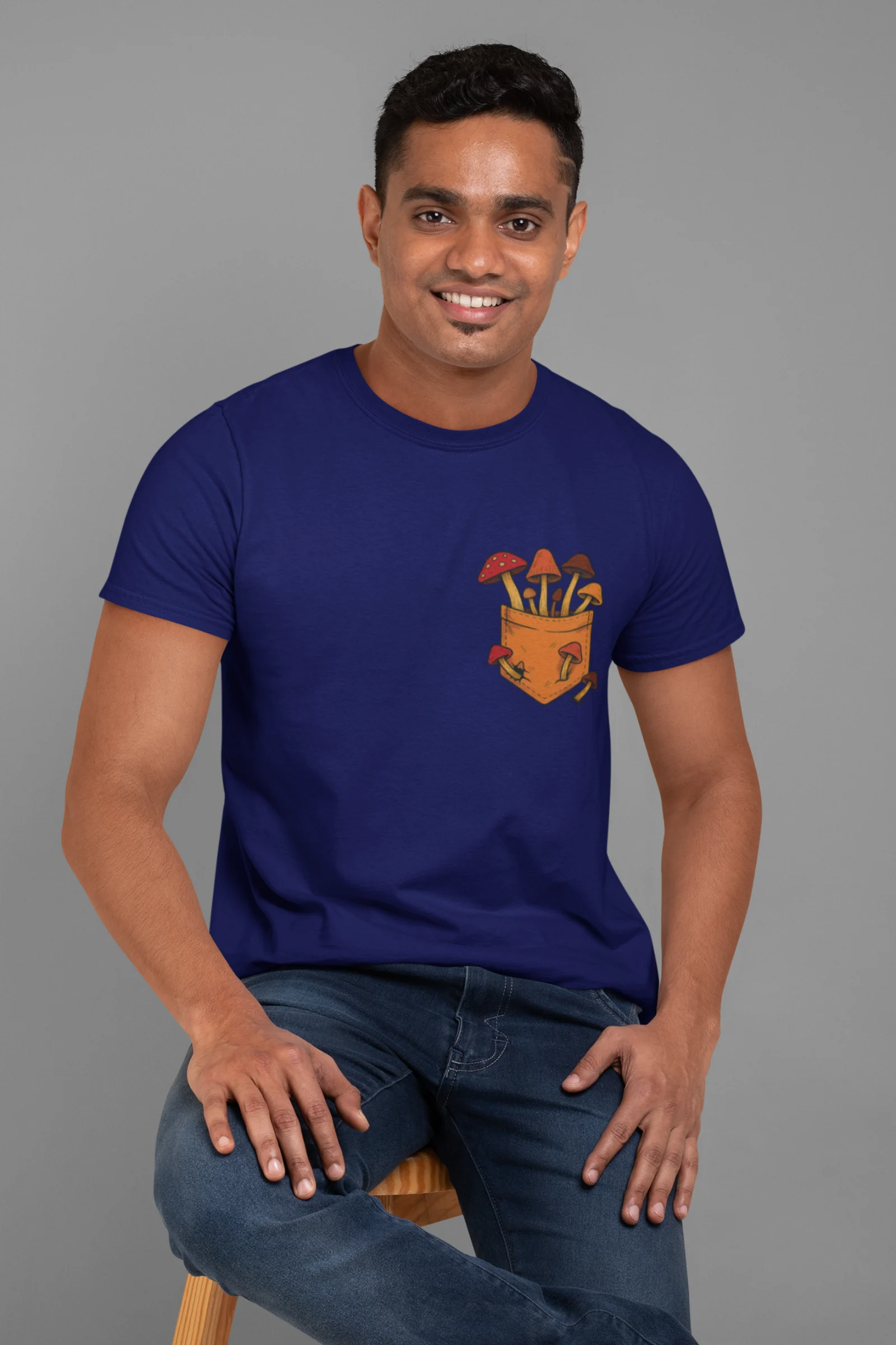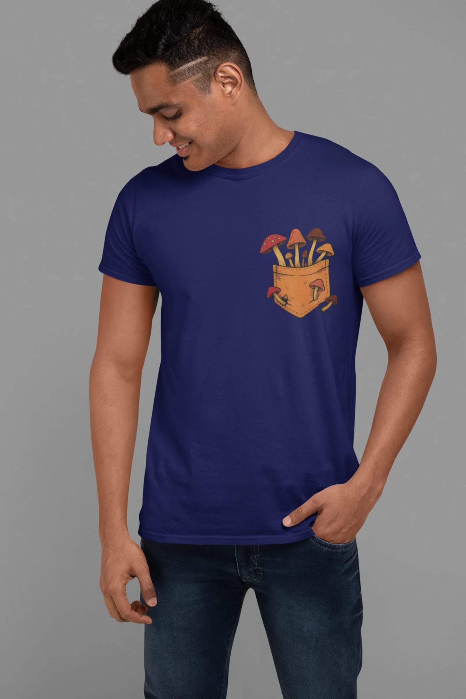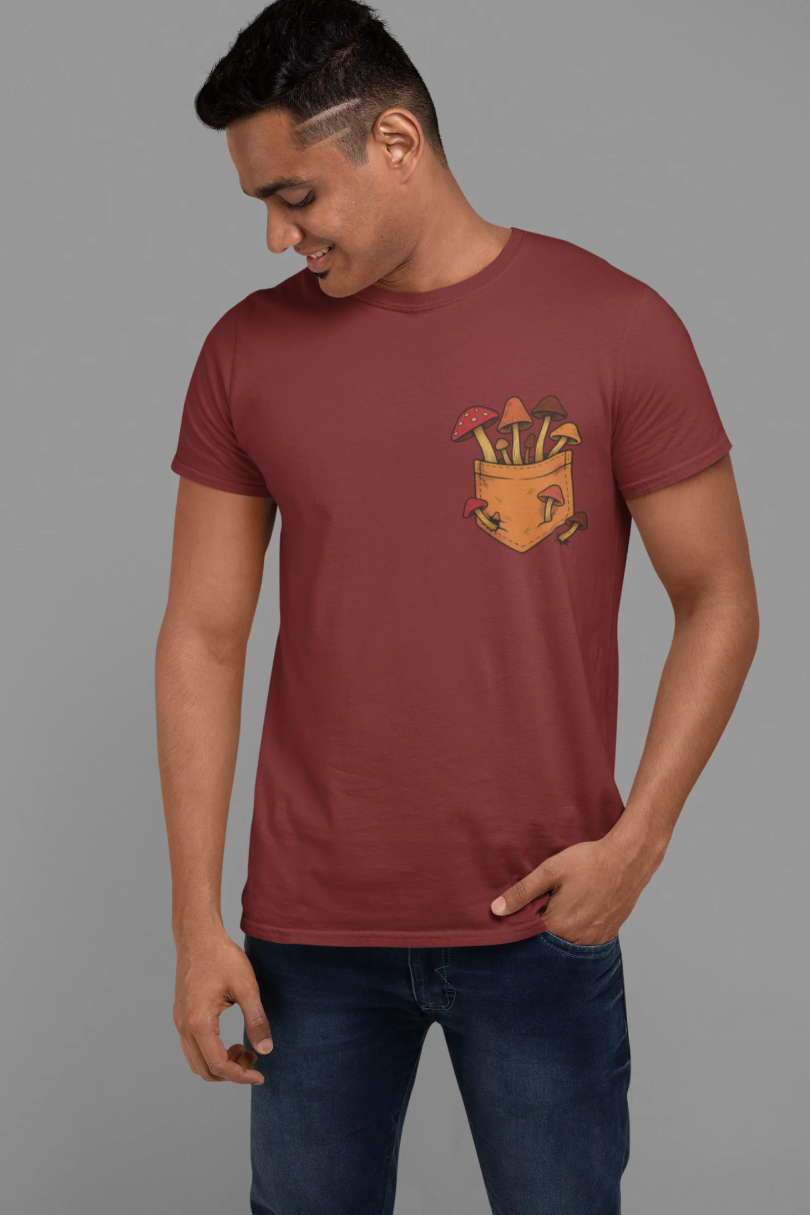 This tee brings a bunch of mischievous mushrooms to your side β popping right out of a βstitched-upβ pocket like theyβve got somewhere to be (probably an afterparty in the forest). Red caps, long stems, and zero regrets.