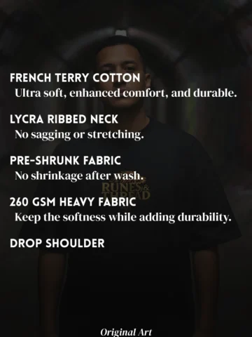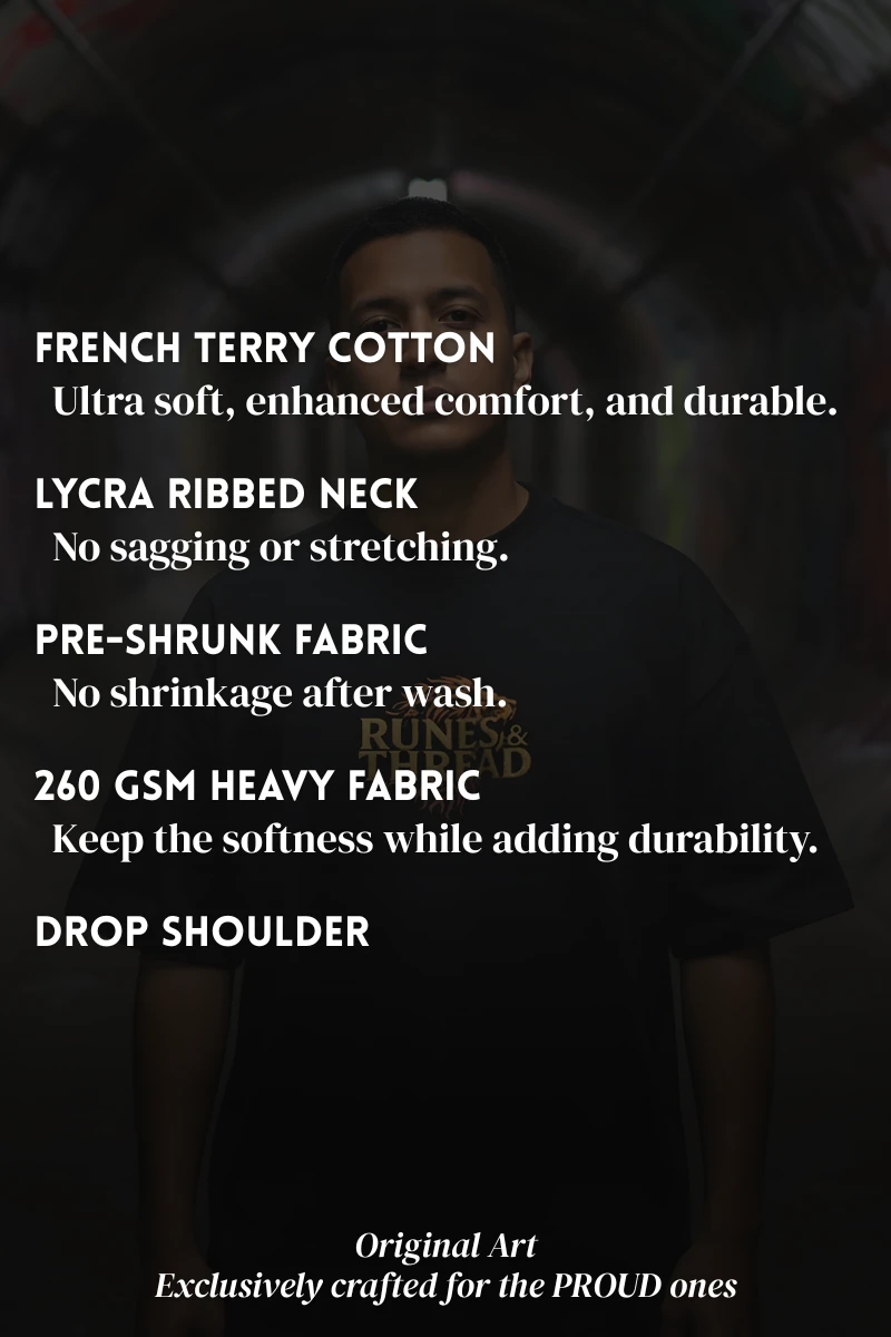 Built to match that presence in an oversized 260 GSM French terry cotton tee , it drapes with authority, feels soft inside, and keeps its shape all day.