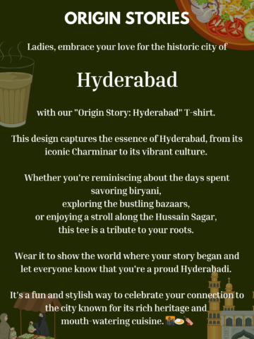 Ladies, embrace your love for the historic city of Hyderabad with our “Origin Story: Hyderabad” T-shirt. This design captures the essence of Hyderabad, from its iconic Charminar to its vibrant culture.