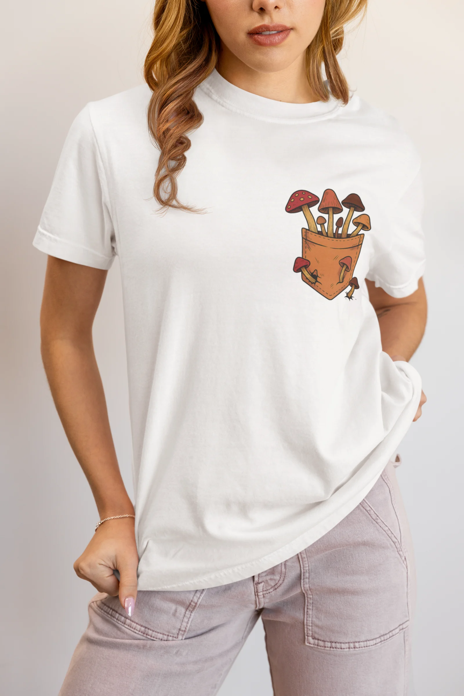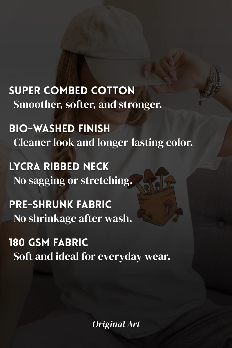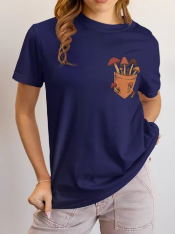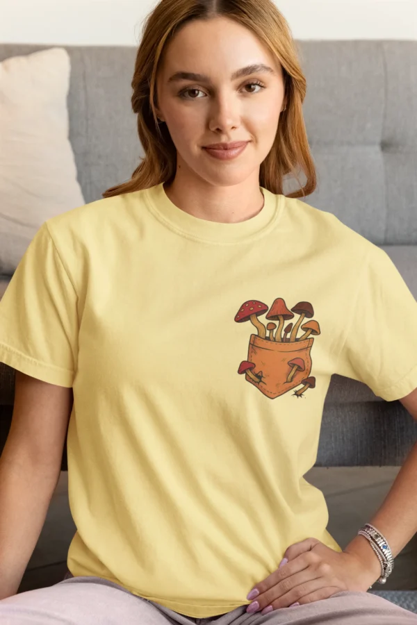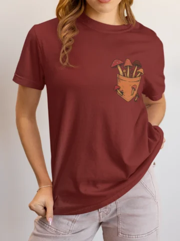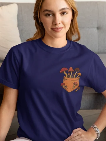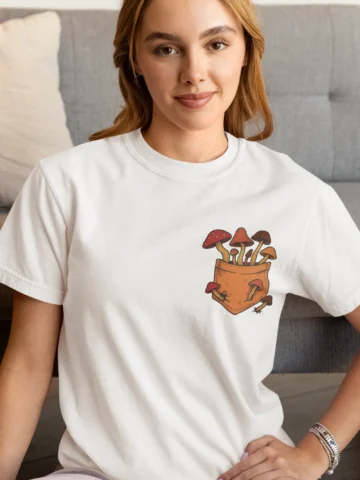 This tee brings a bunch of mischievous mushrooms to your side β€” popping right out of a β€œstitched-up” pocket like they’ve got somewhere to be (probably an afterparty in the forest). Red caps, long stems, and zero regrets.