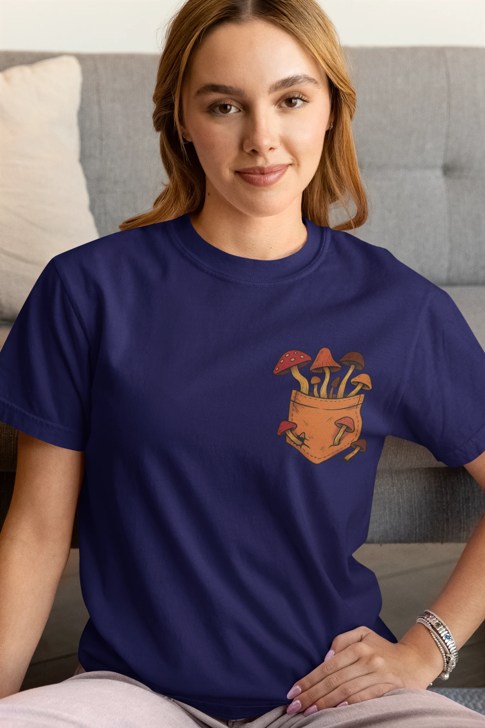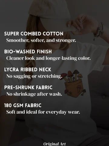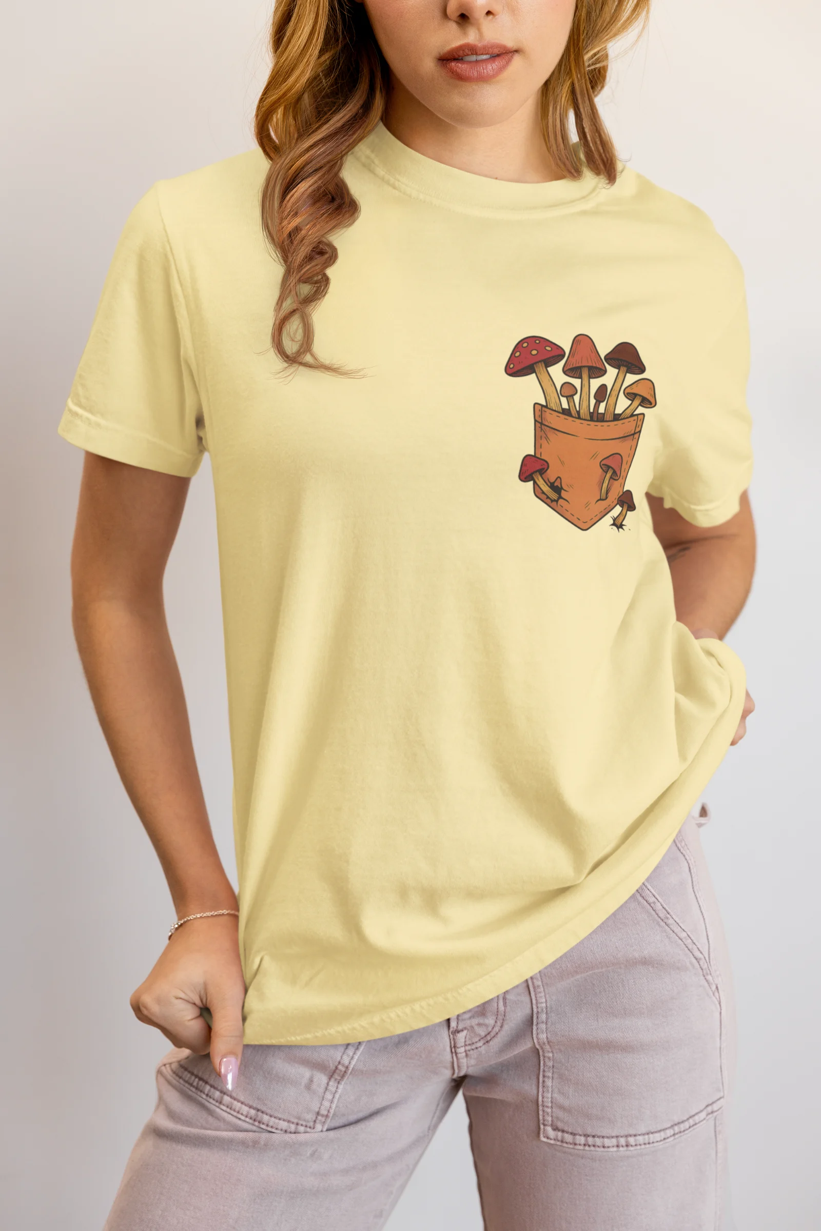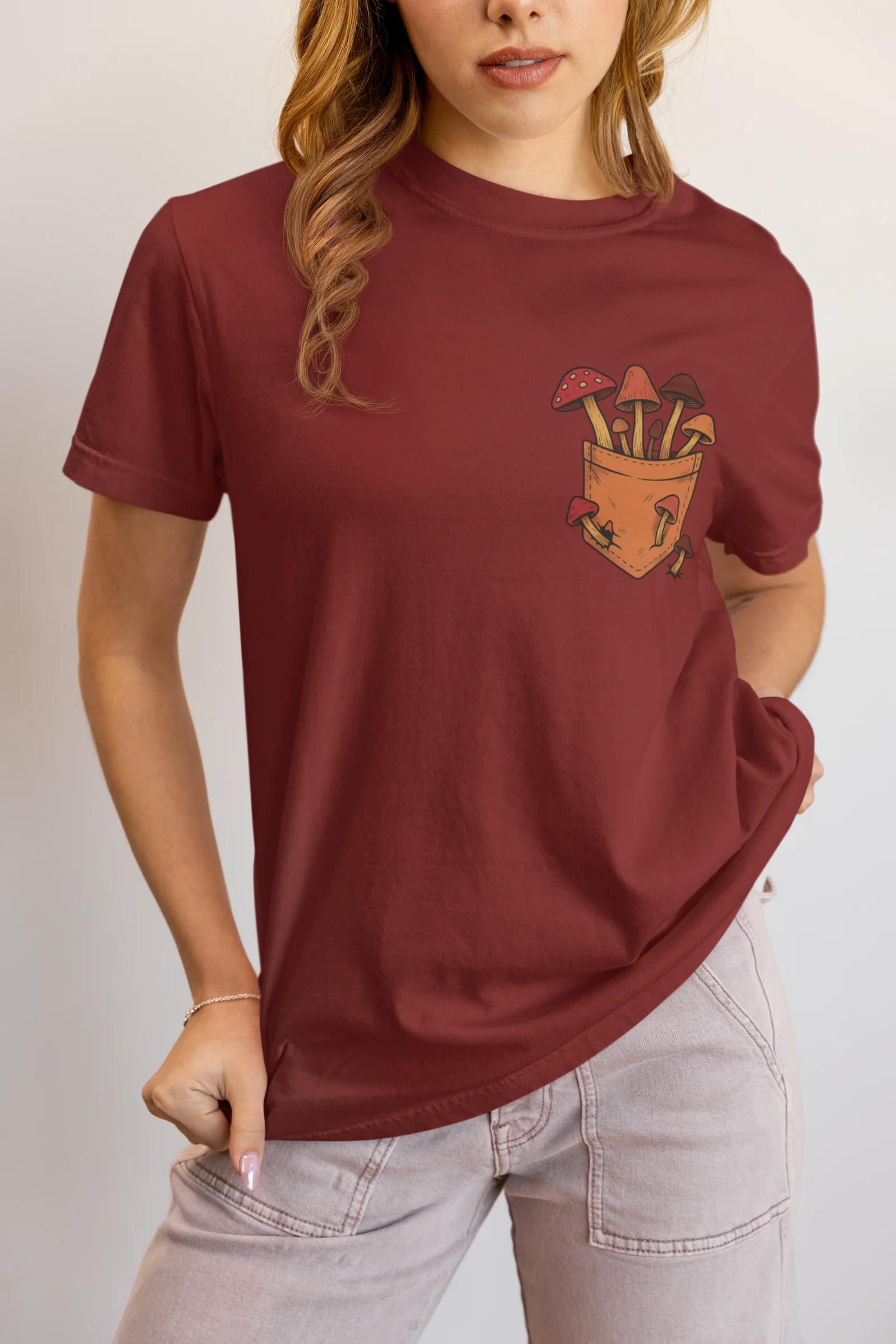 This tee brings a bunch of mischievous mushrooms to your side β€” popping right out of a β€œstitched-up” pocket like they’ve got somewhere to be (probably an afterparty in the forest). Red caps, long stems, and zero regrets.